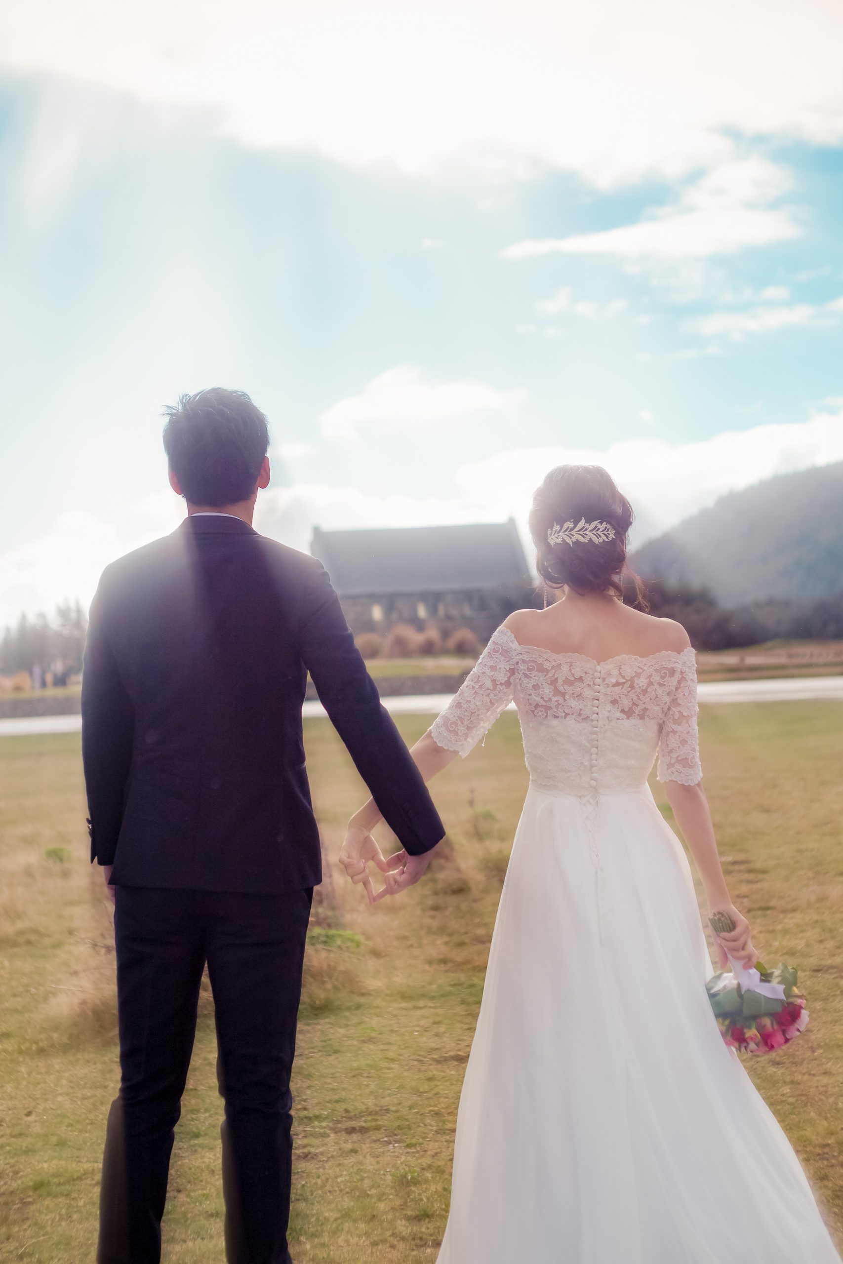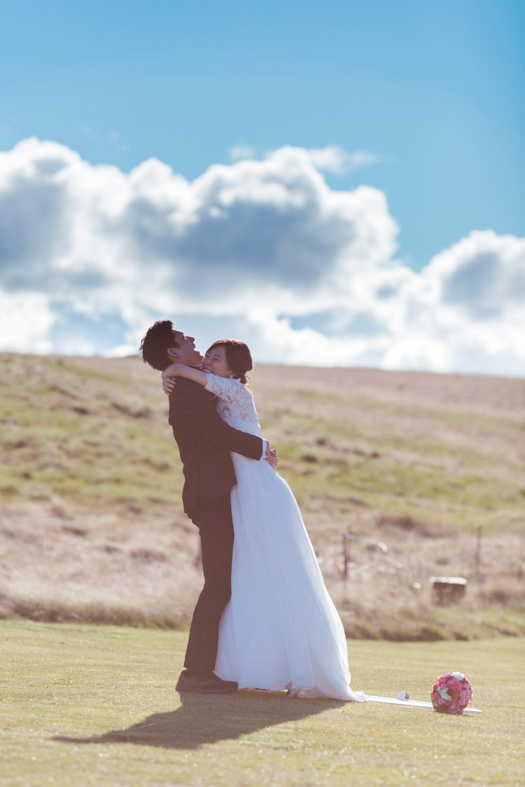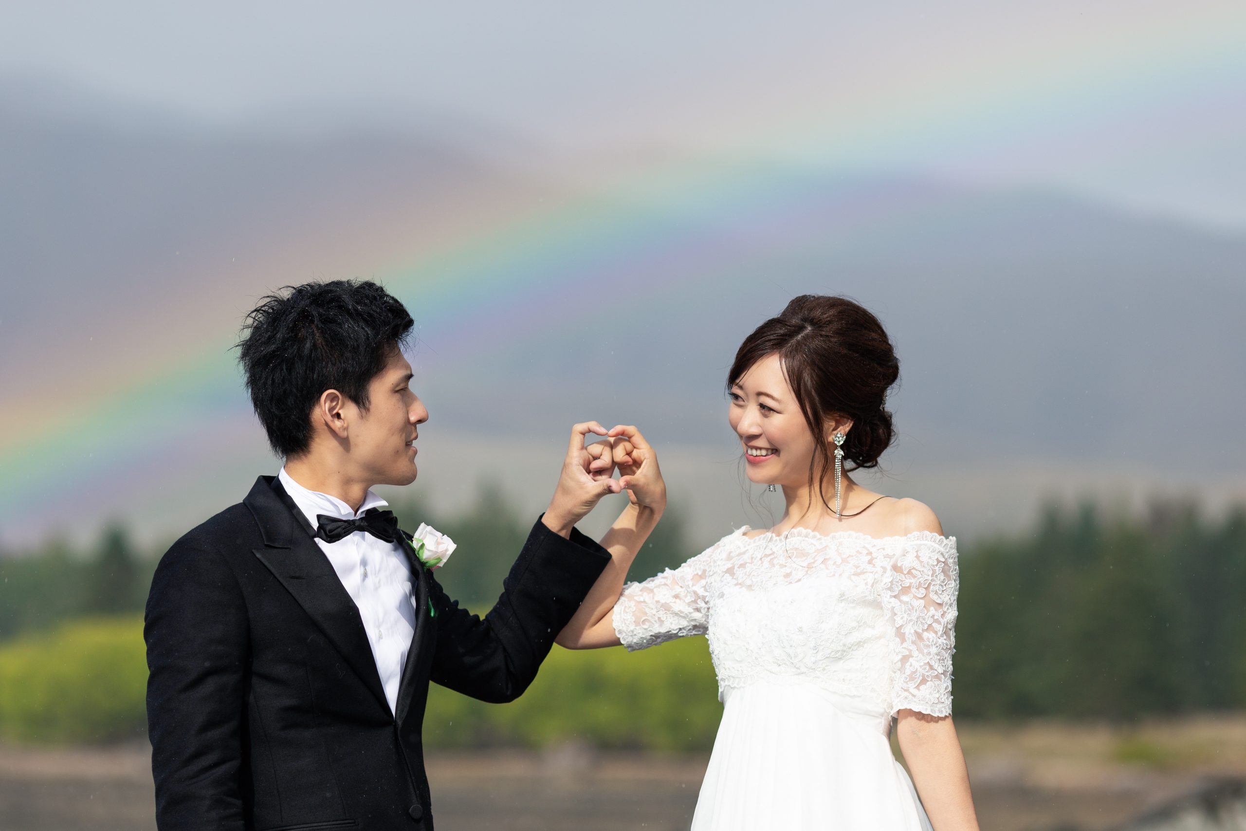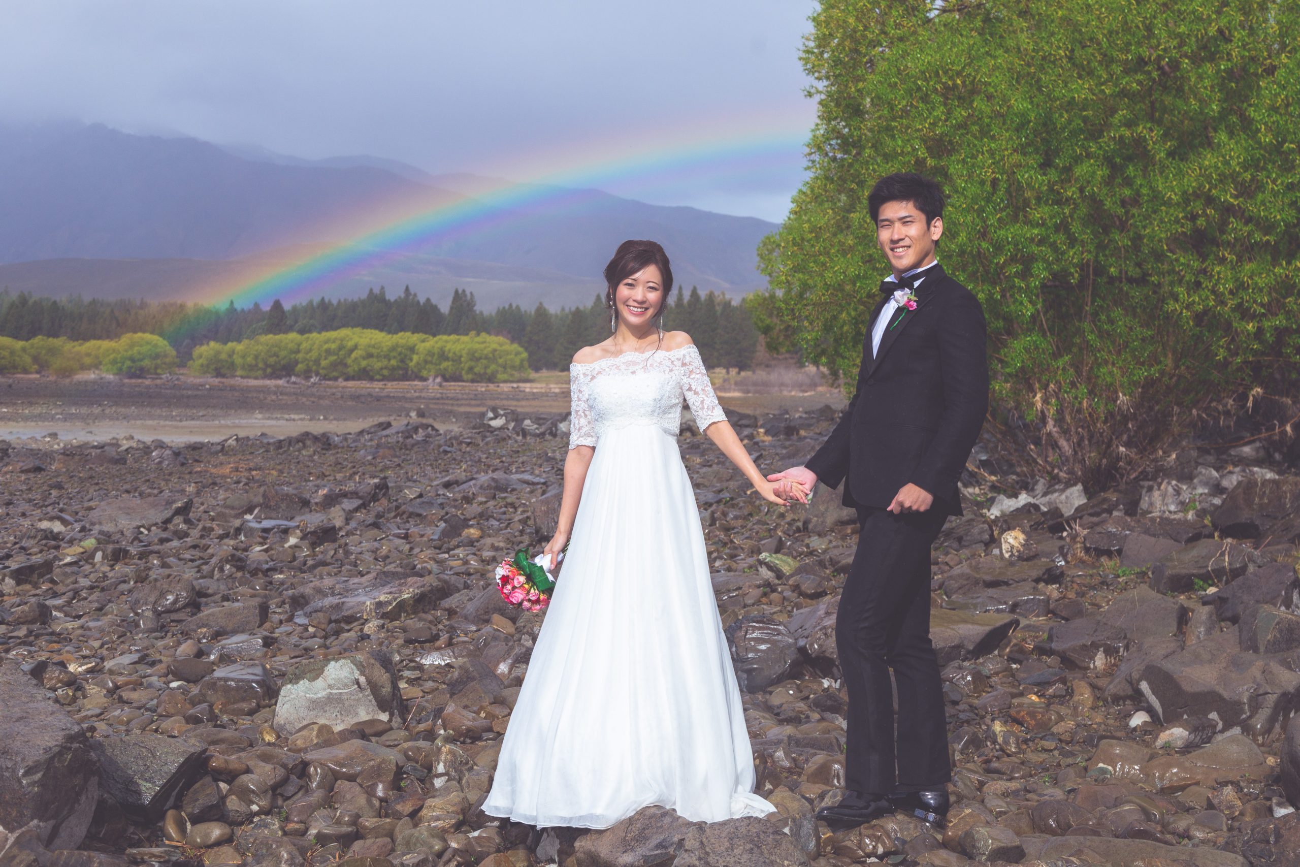 7月の下旬にお問合せいただき、ハネムーンの記念にということで、クイーンズタウンかテカポ湖にて、フォトプランをご希望とのことでした。その後、日本での挙式のご準備などでお忙しくされ、1か月前にお申込みいただきました。当日はお天気が心配でしたが、雨の後には美しい虹がでて、お二人のこれからの人生を祝福しているようでした。