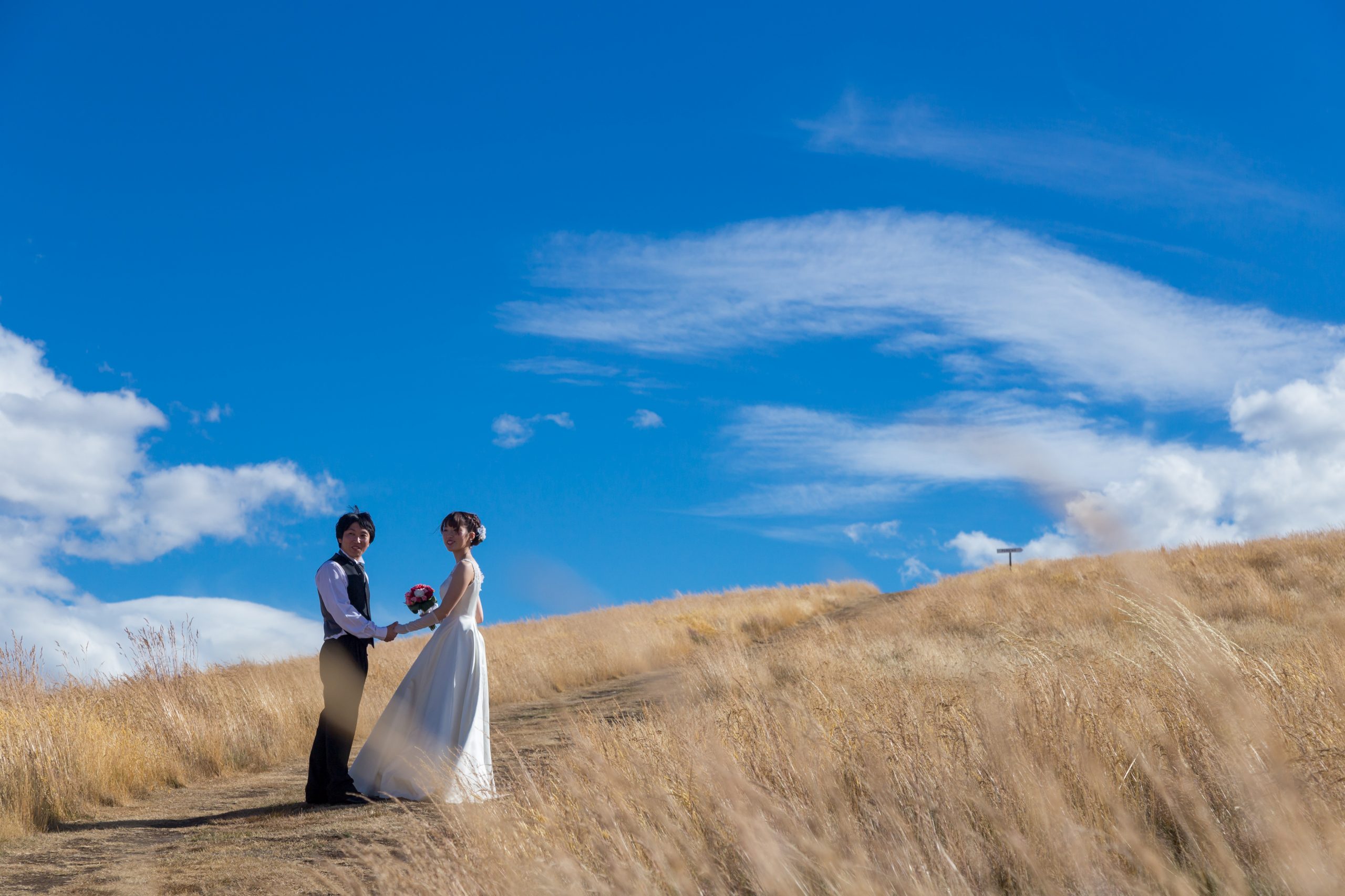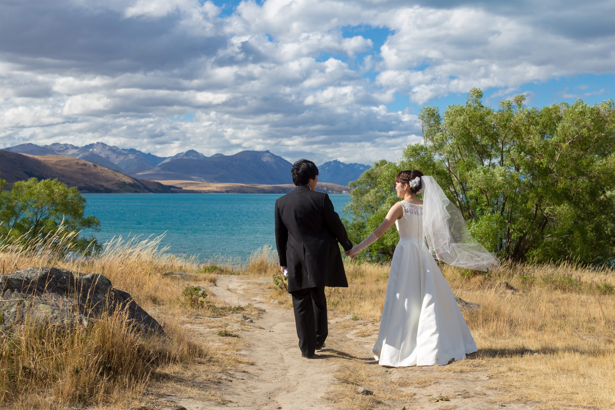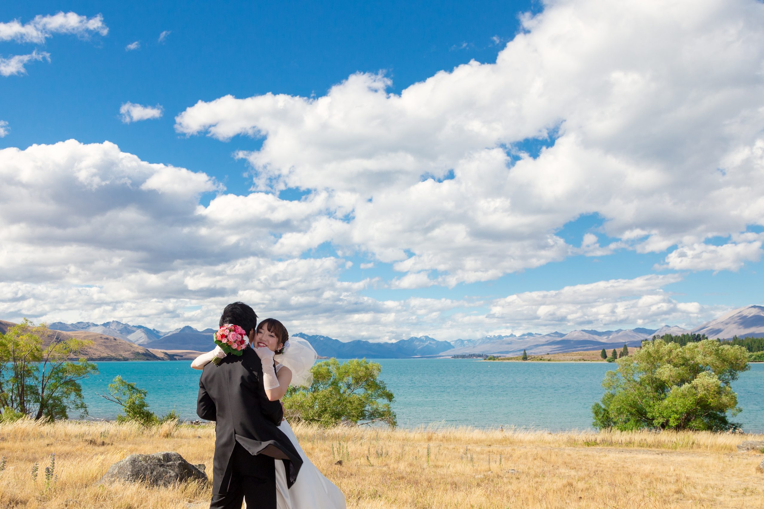 フォトデータを日本での結婚式に使っていただき、皆様にも喜んでいただけましたようで、私たちもとても嬉しく思います。お二人は、クライストチャーチオフィスにて、衣装をレンタルいただき、楽しい時間を過ごさせていただきました。Keiko様は日本の結婚式で着用するドレスと違う雰囲気のドレスをご希望とのことで、胸元にレースが施された上品で控えめなドレスを選ばれました。テカポの大自然の中、とても映え、嬉しく思います。
